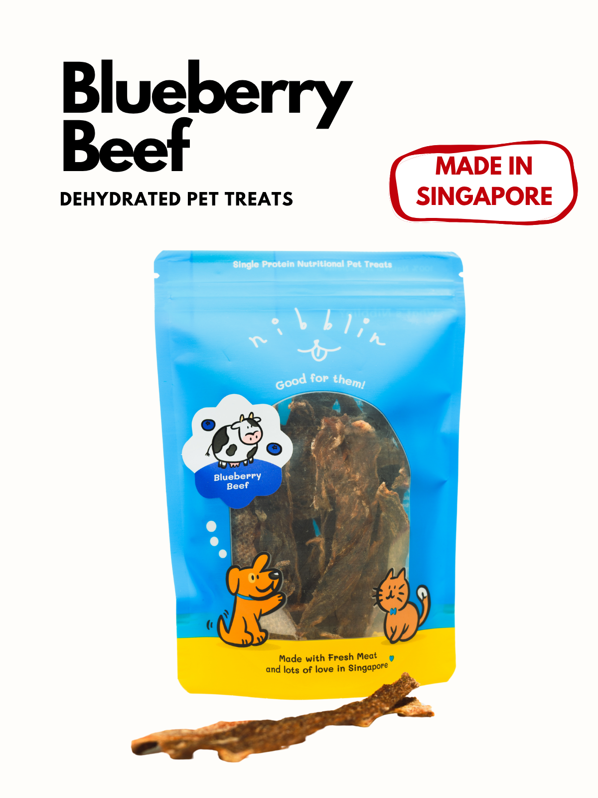 Crafted in our Nibblin headquarters locally, this is made from beef rump (low fat) which is a great source of protein and provides our furbabies with the essential vitamins and minerals they need. Paired with blueberries, this treat is also rich in antioxidants, great for our furbaby’s brain & heart health.