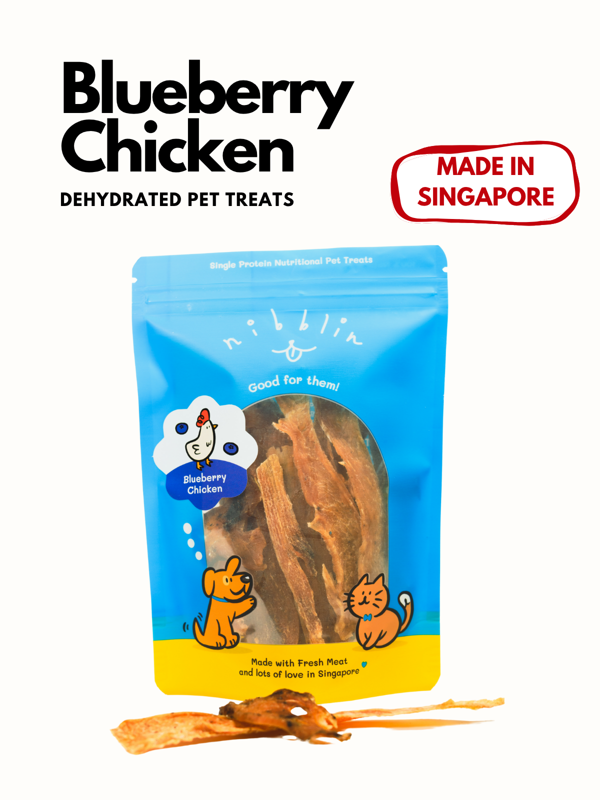 Crafted in our Nibblin headquarters locally, this is made from pure chicken breast, which is a low calorie snack that provides our furbabies with the essential nutrients required for digestion & growth, as well as to build a strong immune system.ย Paired with blueberries, this treat is also rich in antioxidants, great for our furbabyโs brain & heart health.