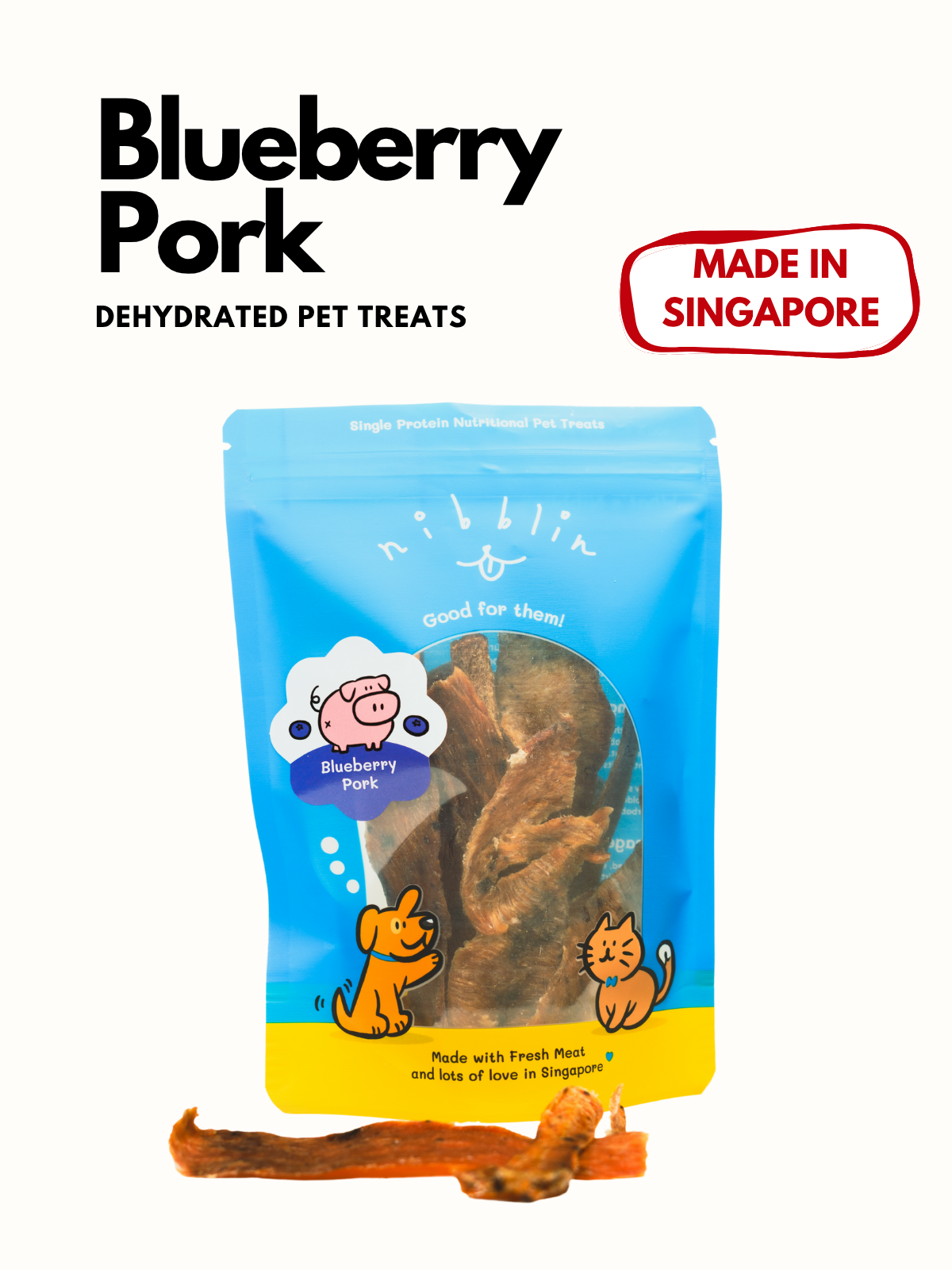 Crafted in our Nibblin headquarters locally, this is made from fresh pork loin meat, a high-quality protein to support muscle growth, energy levels, and overall vitality. Paired with blueberries, this treat is also rich in antioxidants, great for our furbaby’s brain & heart health.