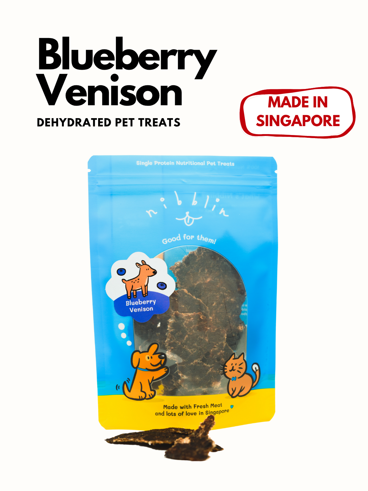 Crafted in our Nibblin headquarters locally, this is made from fresh Venison Forequarter which is lean and low in fat, making it a healthy protein source. It's rich in essential nutrients that support muscle health. Being a novel protein option, this is a great option for furbabies with food sensitivities. Paired with blueberries, this treat is also rich in antioxidants, great for our furbaby’s brain & heart health.
